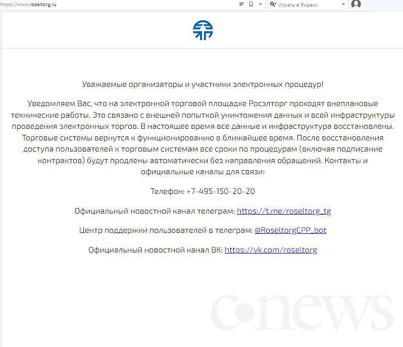 В экстренном сообщении администрация площадки подтвердила попытку тотального уничтожения данных и всей инфраструктуры для проведения электронных торгов. При этом утверждается, что специалистам удалось восстановить информацию и техническую базу. Однако возобновление работы откладывается на неопределенный срок.