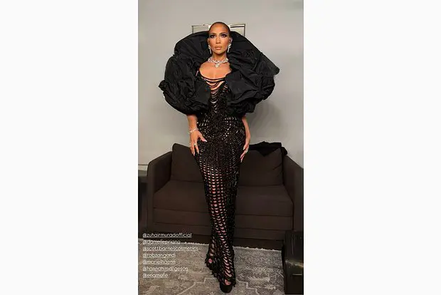 55-летняя дива предстала в черном ажурном наряде от дизайнера Zuhair Murad, подчеркнувшем ее безупречные формы. Модель из сетки с объемным воротником гармонично сочеталась с обувью на массивной платформе. Образ дополнили роскошные аксессуары: каскадное колье, удлиненные серьги и браслет с кольцом. Отметим, что Лопес сознательно отказалась от нижнего белья, сделав лук еще более дерзким.