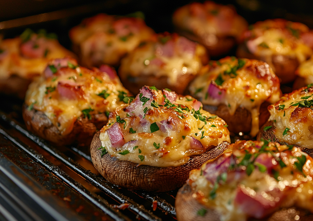 Запечённые грибы с ветчиной и сыром станут настоящим украшением вашего стола! Сочные шляпки, пропитанные нежным маринадом из сметаны и чеснока, сочетаются с золотистой начинкой из лука и копчёной ветчины. А хрустящая сырная корочка добавит блюду изысканности.