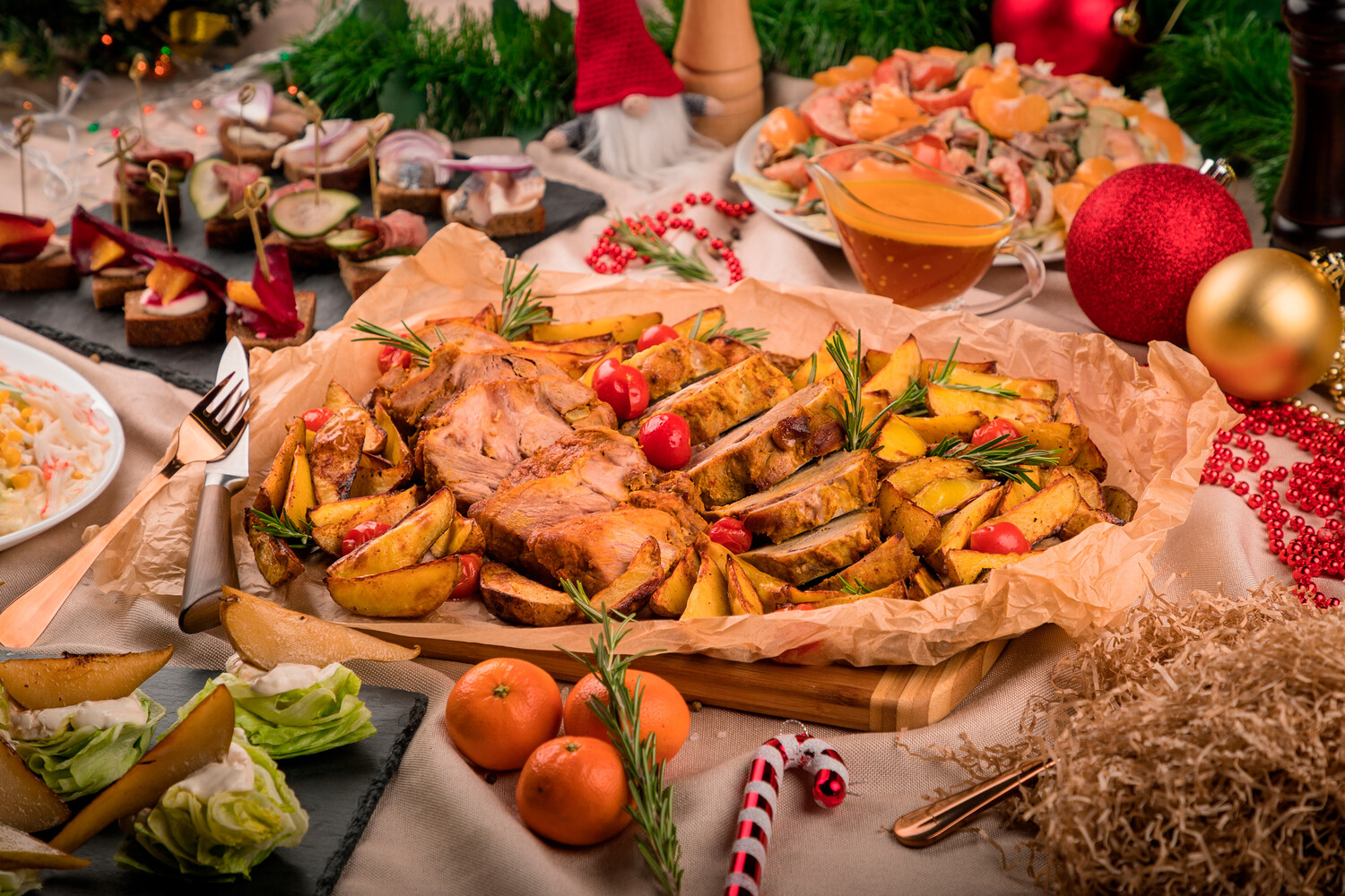 Праздничное меню дополняют свежие фрукты и праздничный торт. Напитки представлены широким ассортиментом: игристое вино, традиционное столовое вино, коньяк, минеральная вода, соки и чай для безалкогольной альтернативы.