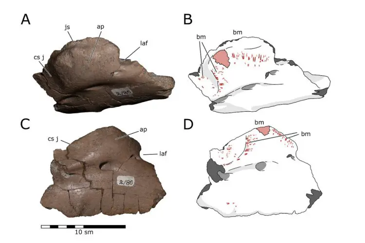 На челюсти гадрозавра ученые нашли характерные парные борозды от резцов многобугорчатых зверьков. Эти следы кардинально отличаются от повреждений хищными динозаврами или насекомыми. Глубокие погрызы, достигающие губчатого слоя кости, могли оставить только животные, целенаправленно грызущие кость, а не просто обгладывающие мясо.