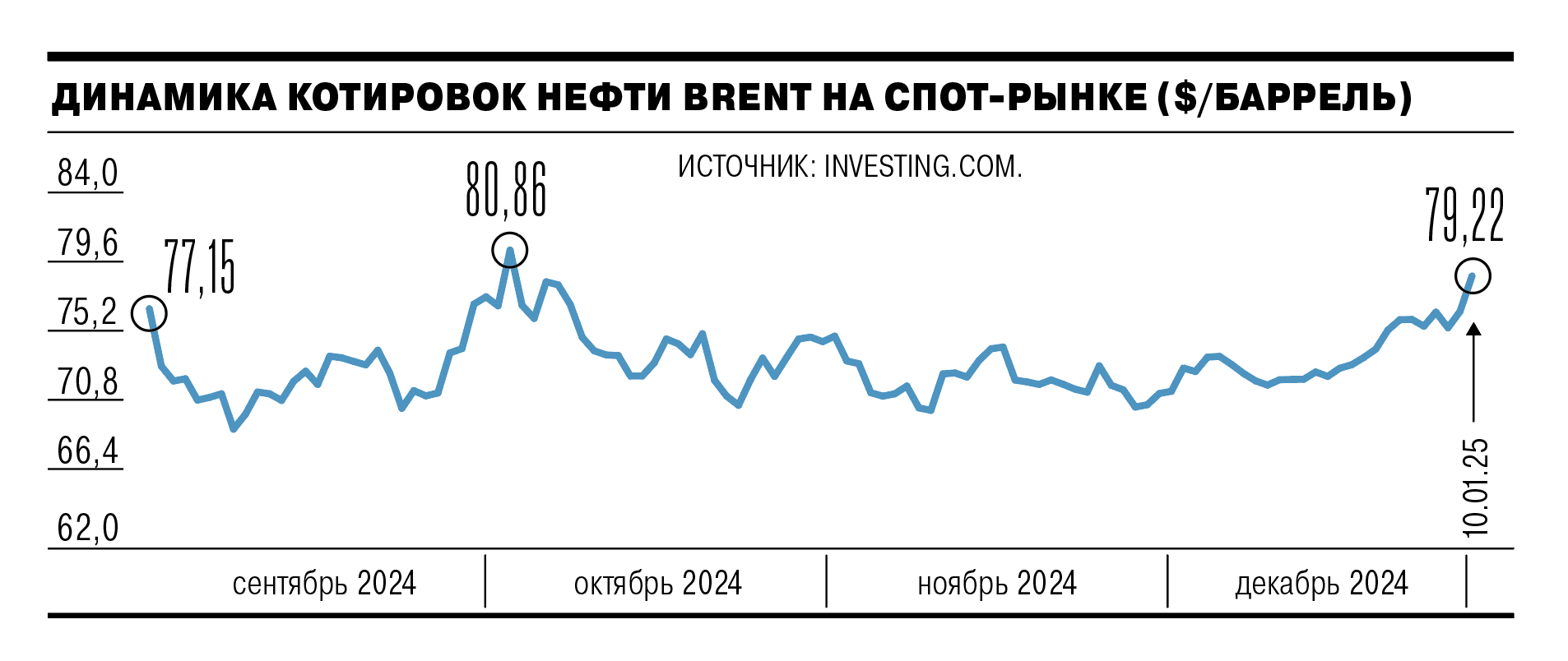 Рыночные «быки» сохраняли оптимистичный настрой, и неделя завершилась на уровне $79,22 за баррель Brent с впечатляющим дневным приростом около 3%. Российская нефть марки Urals также показала уверенный рост, достигнув $76,4 за баррель, а к закрытию торгов установилась на отметке $72,7. Ценовой спред между Urals и Brent остается стабильным в пределах $5-7, что значительно лучше исторических минимумов. По оценке аналитика «Арикапитала» Сергея Суверова, новые меры затронули примерно пятую часть российского нефтяного экспорта.