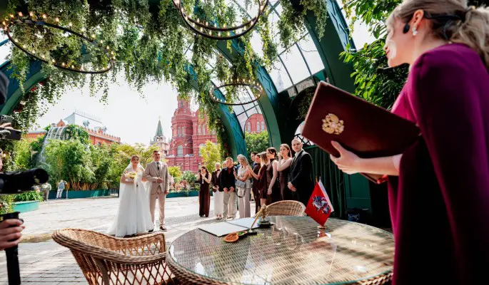 В Москве доступно свыше 50 площадок для торжеств. Сервис «Наша свадьба» на mos.ru поможет подобрать локацию по стилю, наличию парковки или живой музыки. Подать заявление на выездную регистрацию можно онлайн через госуслуги или mos.ru, либо лично во дворцах бракосочетания.
