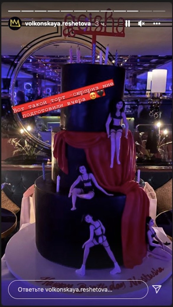 Кульминацией вечера стала презентация эксклюзивного трехъярусного торта, оформленного в стильной красно-черной гамме. Дизайн десерта был вдохновлен новым бизнес-проектом Решетовой — коллекцией премиального нижнего белья. Креативное оформление торта вызвало неоднозначную реакцию гостей, что лишь добавило обсуждаемости мероприятию в социальных сетях.
