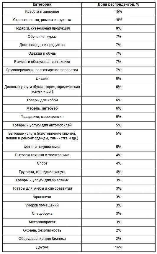 Лидером предпринимательской активности стала сфера красоты и здоровья (15%). На втором месте — строительство и ремонт (10%), следом идут создатели уникальных подарков (9%). Равную популярность (по 7%) набрали образовательные проекты, доставка продуктов, fashion-индустрия, сервисы по ремонту техники и логистические услуги.