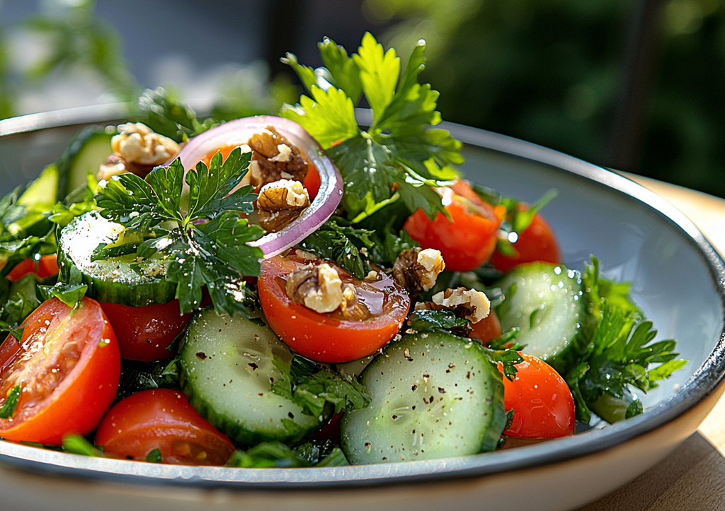 Свежие помидоры, огурцы, лук, пучок петрушки и кинзы, чеснок, грецкие орехи, оливковое масло, лимонный сок и соль. Ингредиенты подобраны так, чтобы каждый кусочек дарил сочность и насыщенный вкус.