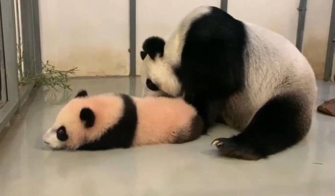 В Московском зоопарке продолжается увлекательная история взаимоотношений юной панды Катюши и ее заботливой мамы Диндин.