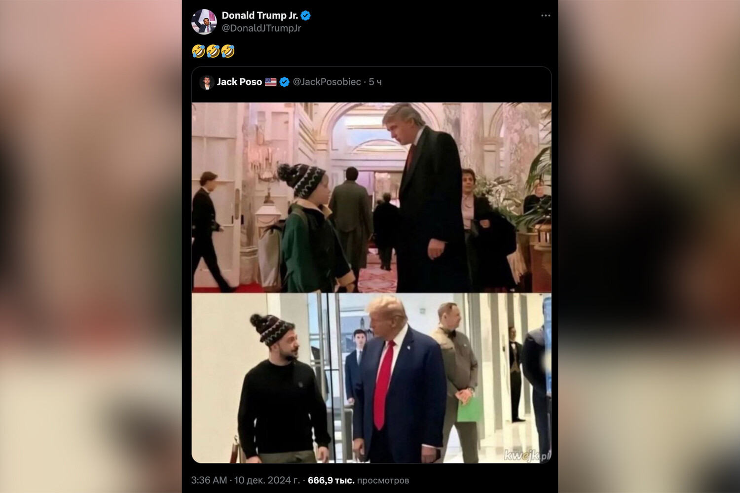 Известный предприниматель Илон Маск и Дональд Трамп-младший отреагировали с юмором на оригинальный фотоколлаж, сопоставляющий сцену из популярного фильма «Один дома 2: Потерявшийся в Нью-Йорке» с реальной встречей политических деятелей. Оба прокомментировали публикацию в социальной сети X, используя веселые эмодзи.