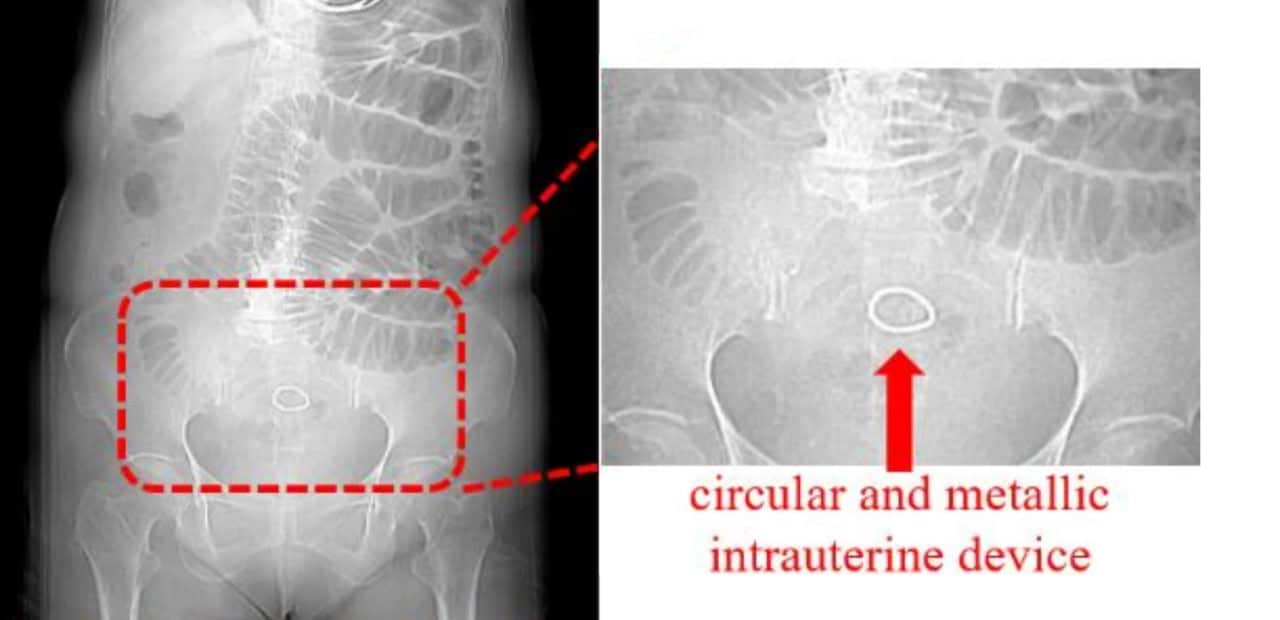 Повторная компьютерная томография всего живота позволила обнаружить кишечную непроходимость, признаки перитонита и необычное металлическое кольцо в малом тазу. Во время экстренной операции выяснилось: это оказалась внутриматочная спираль, установленная 47 лет назад. После наступления менопаузы женщина не посещала гинеколога, что позволило ВМС незаметно сместиться в брюшную полость и вызвать осложнения.