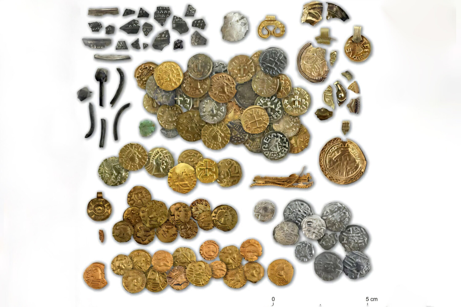 Территория раскопок порадовала исследователей тремя богатыми участками с драгоценными артефактами. Среди сокровищ выделяются 24 великолепные золотые монеты тремиссы, изящная золотая подвеска и искусно выполненная серебряная серьга. Помимо драгоценностей, значительный научный интерес представляют 17 обнаруженных столбовых углублений, выстроенных в чёткую линию с западной на восточную сторону.